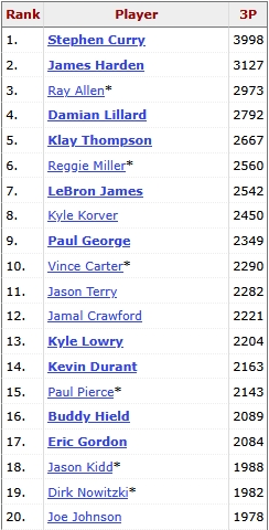 1. 詹姆斯-哈登(目前约2900+三分)(注:DeepSeek数据库截止2023年底,实际数据为3127)
