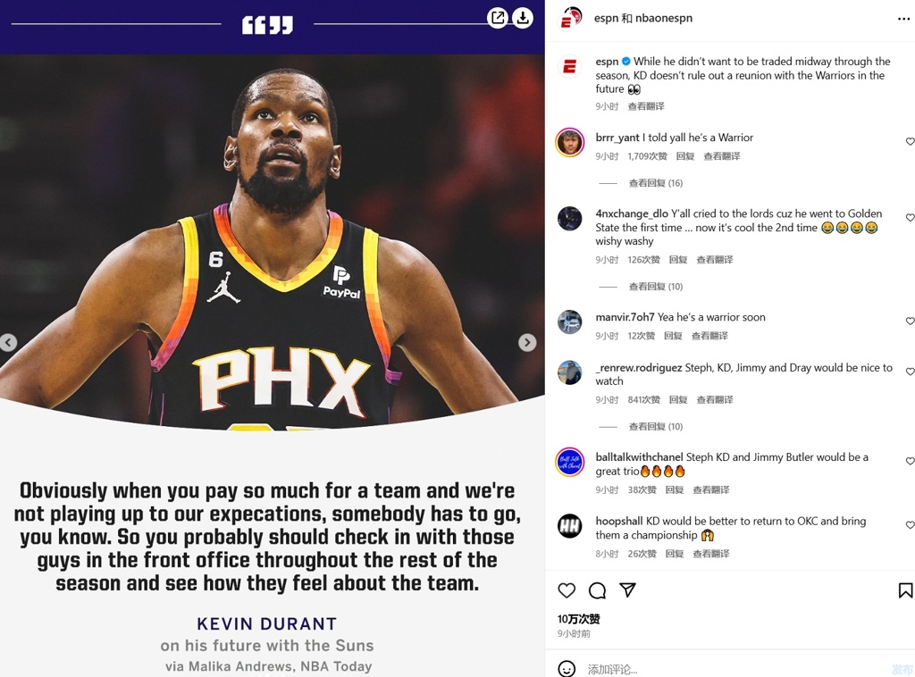 ESPN官方晒出采访并写道:“尽管杜兰特表示他不想要在赛季中被交易,但是KD并没有排除未来和勇士重聚的可能。”