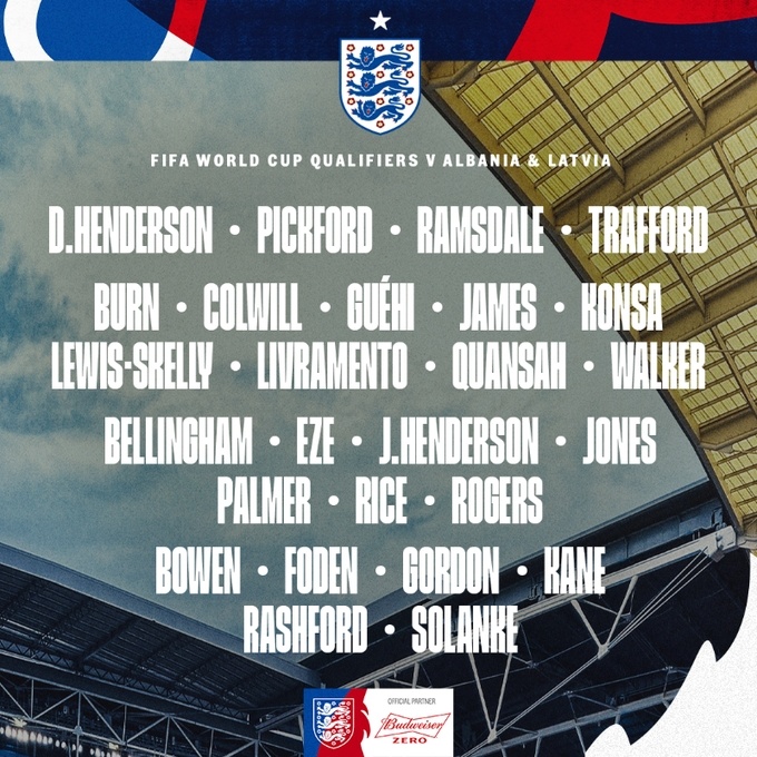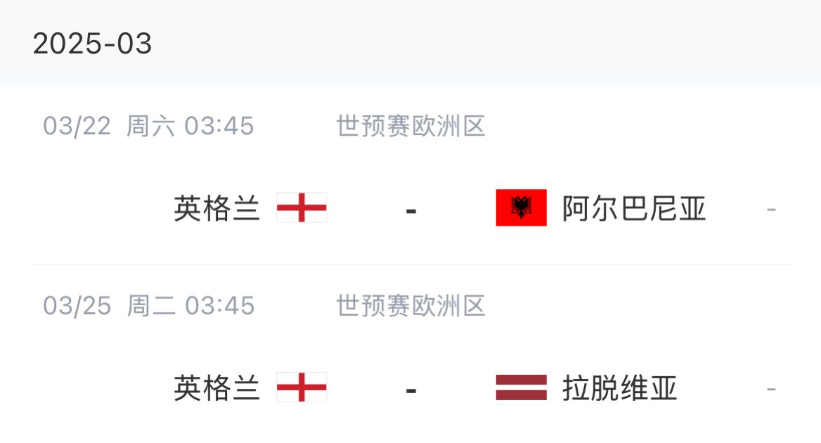 本期英格兰队将在3月底出战两场世预赛,对手分别是阿尔巴尼亚和拉脱维亚。